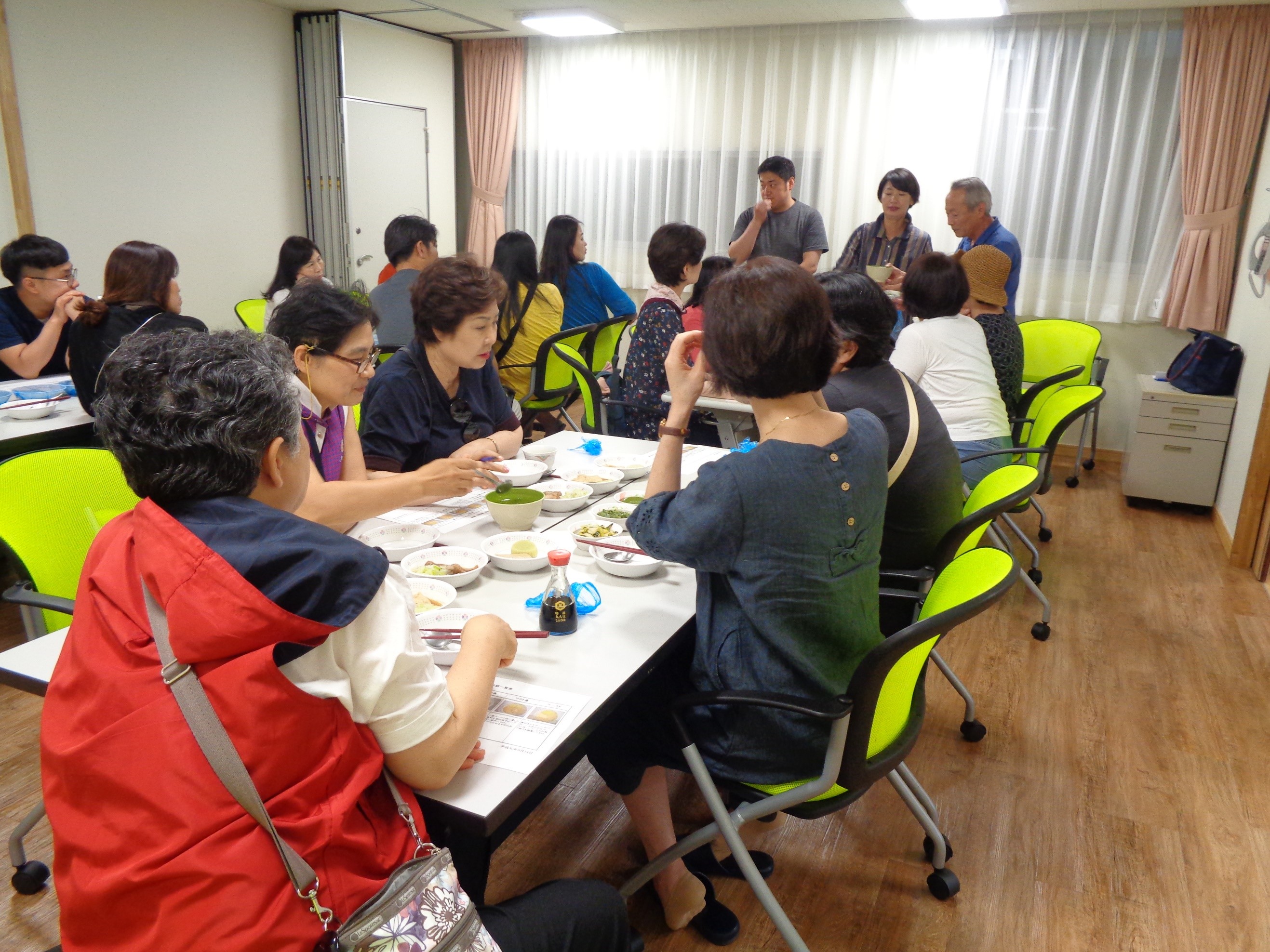 青い鳥会の職員を通じて、韓国の平澤社会福祉協議会の方々が見学にお越しくださいました。メンバーは違いますが、来園自体は昨年に引き続き2回目。デイサービス等で働かれている方も多く、施設の中を興味深そうに見て回られました。