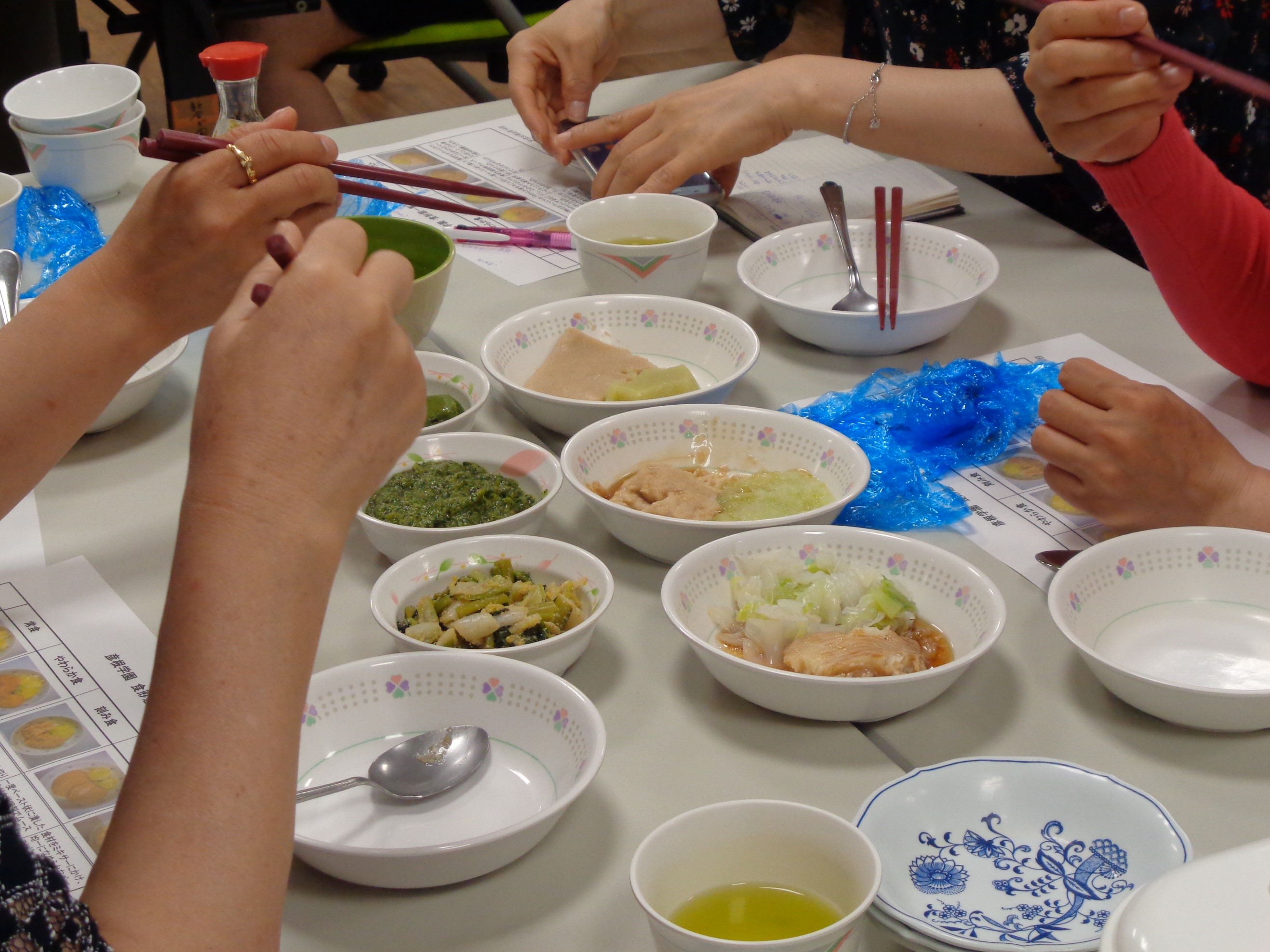 この日は、煮魚(鰈)・キャベツの添え・小松菜のお浸しの常食・刻み食・ソフト食をそれぞれ試食していただき、和風だしのとろみや粥も用意しました。